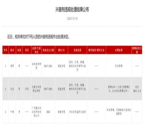 12月10日,中国反兴奋剂中心在官网公布一则重磅罚单:对内蒙古体育职业学院中长跑教练刘宝禁赛15年(之前已被禁赛3年,此次追加禁赛12年),对吉林体育学院杨明实施终身禁赛。