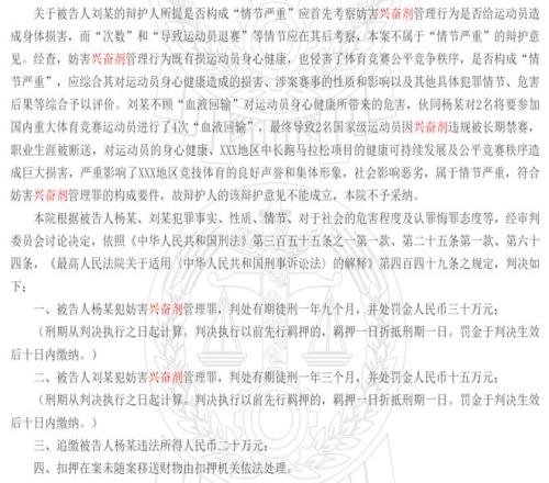 法院的判词还写到:杨明、刘宝的行为导致运动员被长期禁赛、断送职业生涯,对运动员身心健康、公平公正竞赛秩序及体育科研队伍风气均造成了巨大损害,严重影响田径项目持续发展,社会影响极其恶劣。